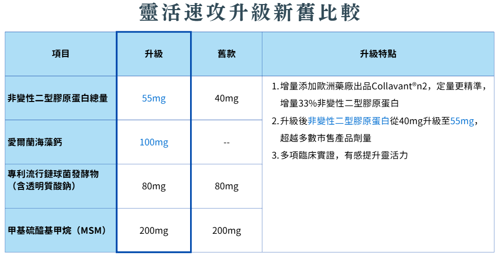 迅速有感|突破市場劑量足量添加,非變性二型膠原蛋白55 mg+流行鏈球菌發酵物(含透明質酸鈉)80 mg